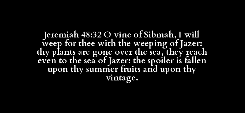 Jeremiah 48:32 O vine of Sibmah, I will weep for thee with the weeping of Jazer: thy plants are gone over the sea, they reach even to the sea of Jazer: the spoiler is fallen upon thy summer fruits and upon thy vintage.