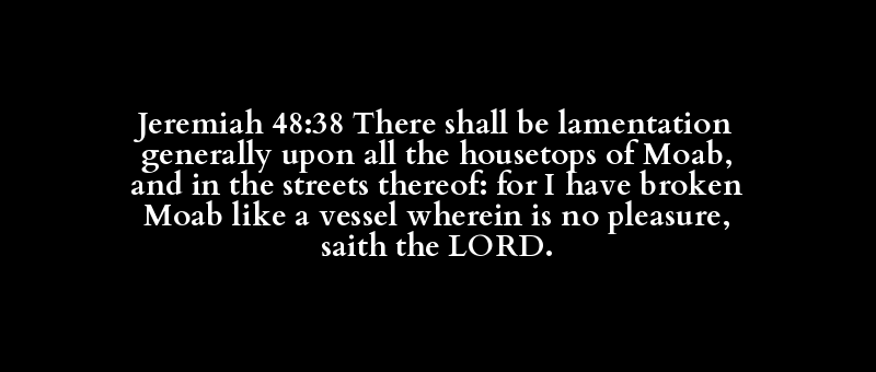 Jeremiah 48:38 There shall be lamentation generally upon all the housetops of Moab, and in the streets thereof: for I have broken Moab like a vessel wherein is no pleasure, saith the LORD.
