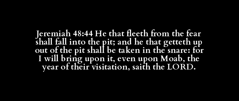 Jeremiah 48:44 He that fleeth from the fear shall fall into the pit; and he that getteth up out of the pit shall be taken in the snare: for I will bring upon it, even upon Moab, the year of their visitation, saith the LORD.