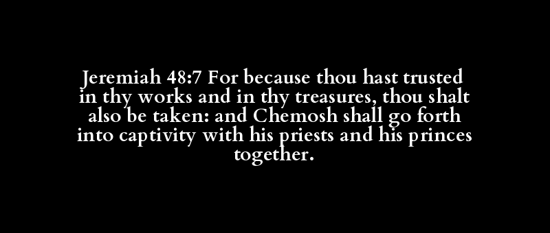 Jeremiah 48:7 For because thou hast trusted in thy works and in thy treasures, thou shalt also be taken: and Chemosh shall go forth into captivity with his priests and his princes together.