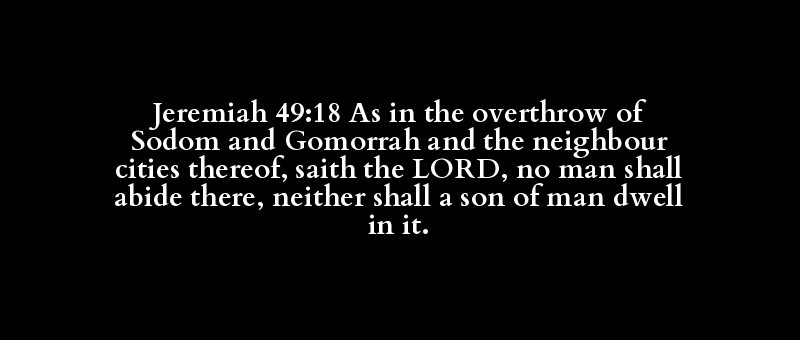 Jeremiah 49:18 As in the overthrow of Sodom and Gomorrah and the neighbour cities thereof, saith the LORD, no man shall abide there, neither shall a son of man dwell in it.