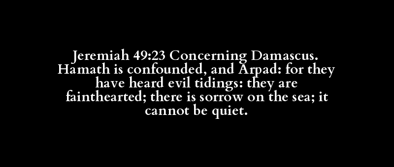 Jeremiah 49:23 Concerning Damascus. Hamath is confounded, and Arpad: for they have heard evil tidings: they are fainthearted; there is sorrow on the sea; it cannot be quiet.