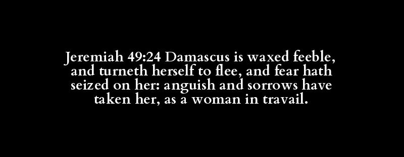 Jeremiah 49:24 Damascus is waxed feeble, and turneth herself to flee, and fear hath seized on her: anguish and sorrows have taken her, as a woman in travail.