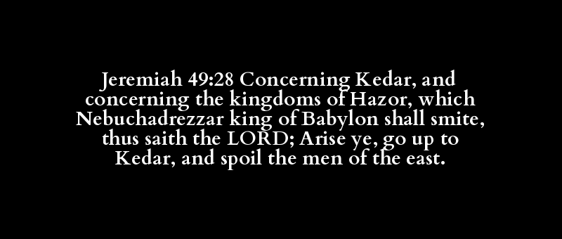 Jeremiah 49:28 Concerning Kedar, and concerning the kingdoms of Hazor, which Nebuchadrezzar king of Babylon shall smite, thus saith the LORD; Arise ye, go up to Kedar, and spoil the men of the east.