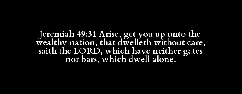 Jeremiah 49:31 Arise, get you up unto the wealthy nation, that dwelleth without care, saith the LORD, which have neither gates nor bars, which dwell alone.