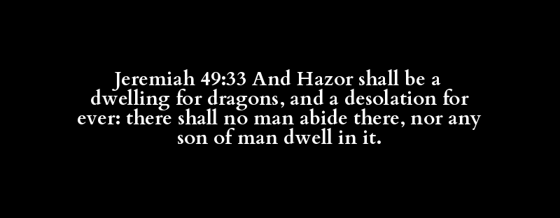Jeremiah 49:33 And Hazor shall be a dwelling for dragons, and a desolation for ever: there shall no man abide there, nor any son of man dwell in it.
