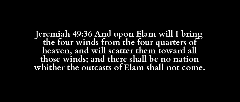 Jeremiah 49:36 And upon Elam will I bring the four winds from the four quarters of heaven, and will scatter them toward all those winds; and there shall be no nation whither the outcasts of Elam shall not come.