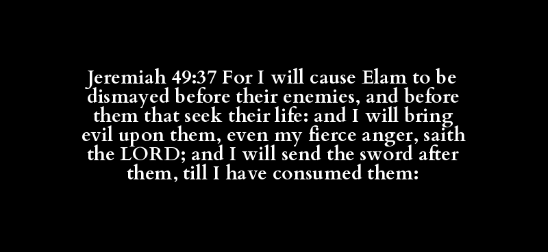 Jeremiah 49:37 For I will cause Elam to be dismayed before their enemies, and before them that seek their life: and I will bring evil upon them, even my fierce anger, saith the LORD; and I will send the sword after them, till I have consumed them: