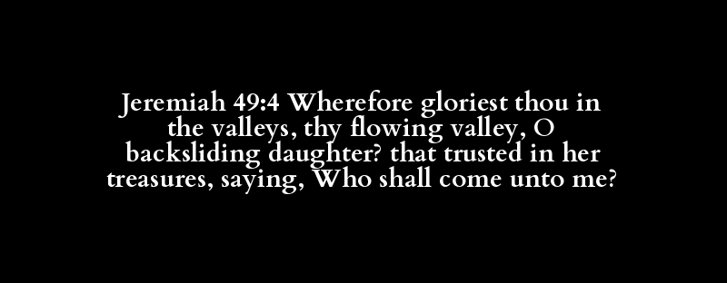Jeremiah 49:4 Wherefore gloriest thou in the valleys, thy flowing valley, O backsliding daughter? that trusted in her treasures, saying, Who shall come unto me?