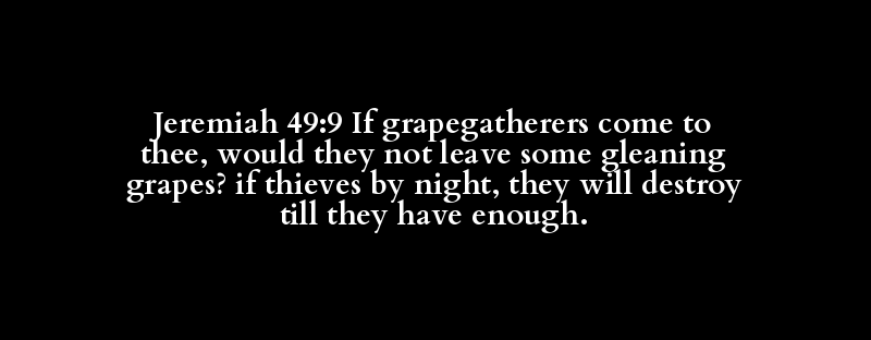 Jeremiah 49:9 If grapegatherers come to thee, would they not leave some gleaning grapes? if thieves by night, they will destroy till they have enough.