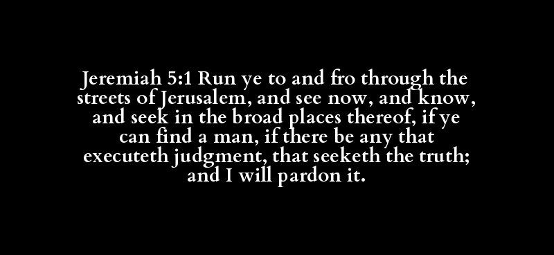 Jeremiah 5:1 Run ye to and fro through the streets of Jerusalem, and see now, and know, and seek in the broad places thereof, if ye can find a man, if there be any that executeth judgment, that seeketh the truth; and I will pardon it.
