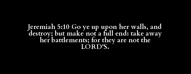 Jeremiah 5:10 Go ye up upon her walls, and destroy; but make not a full end: take away her battlements; for they are not the LORD'S.