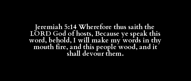 Jeremiah 5:14 Wherefore thus saith the LORD God of hosts, Because ye speak this word, behold, I will make my words in thy mouth fire, and this people wood, and it shall devour them.