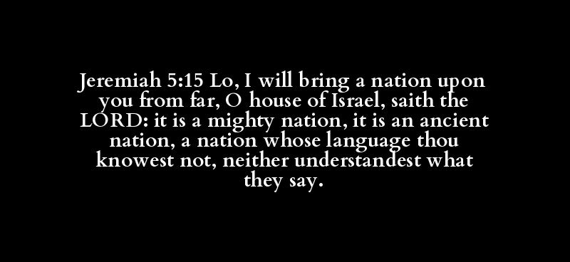 Jeremiah 5:15 Lo, I will bring a nation upon you from far, O house of Israel, saith the LORD: it is a mighty nation, it is an ancient nation, a nation whose language thou knowest not, neither understandest what they say.