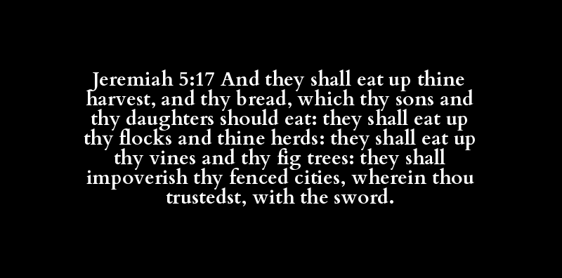 Jeremiah 5:17 And they shall eat up thine harvest, and thy bread, which thy sons and thy daughters should eat: they shall eat up thy flocks and thine herds: they shall eat up thy vines and thy fig trees: they shall impoverish thy fenced cities, wherein thou trustedst, with the sword.