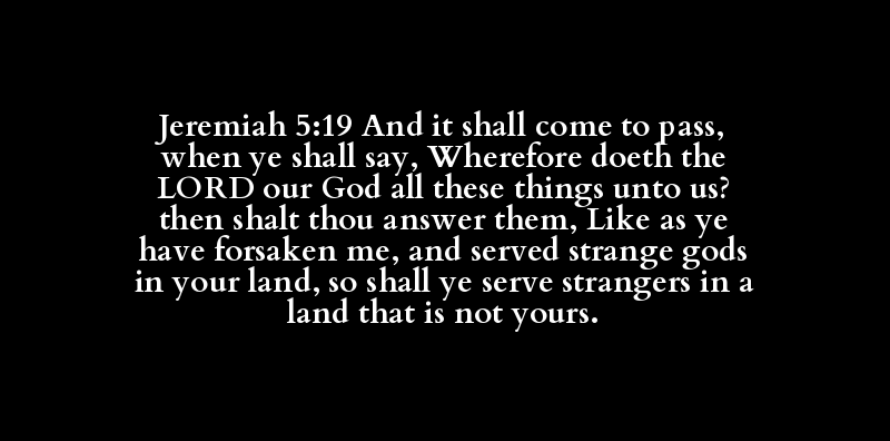 Jeremiah 5:19 And it shall come to pass, when ye shall say, Wherefore doeth the LORD our God all these things unto us? then shalt thou answer them, Like as ye have forsaken me, and served strange gods in your land, so shall ye serve strangers in a land that is not yours.