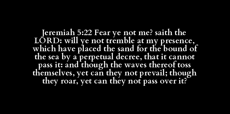 Jeremiah 5:22 Fear ye not me? saith the LORD: will ye not tremble at my presence, which have placed the sand for the bound of the sea by a perpetual decree, that it cannot pass it: and though the waves thereof toss themselves, yet can they not prevail; though they roar, yet can they not pass over it?