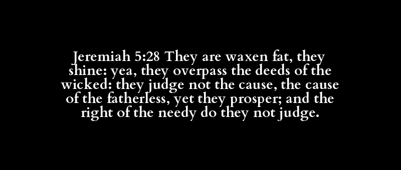 Jeremiah 5:28 They are waxen fat, they shine: yea, they overpass the deeds of the wicked: they judge not the cause, the cause of the fatherless, yet they prosper; and the right of the needy do they not judge.