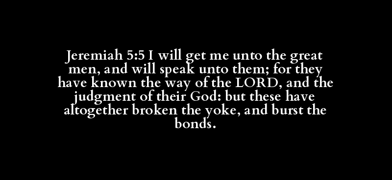Jeremiah 5:5 I will get me unto the great men, and will speak unto them; for they have known the way of the LORD, and the judgment of their God: but these have altogether broken the yoke, and burst the bonds.