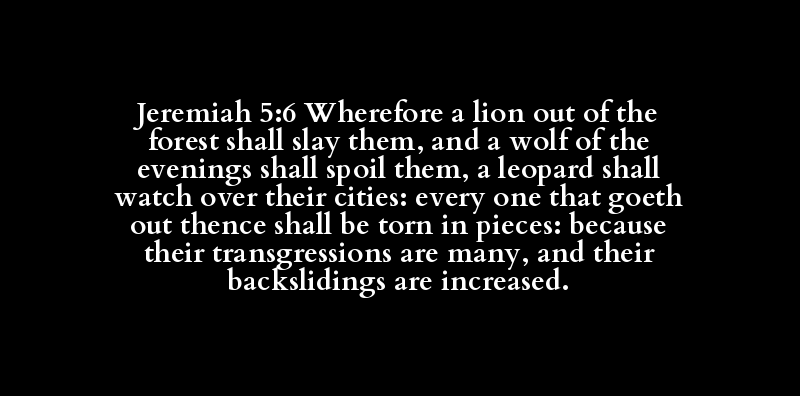 Jeremiah 5:6 Wherefore a lion out of the forest shall slay them, and a wolf of the evenings shall spoil them, a leopard shall watch over their cities: every one that goeth out thence shall be torn in pieces: because their transgressions are many, and their backslidings are increased.