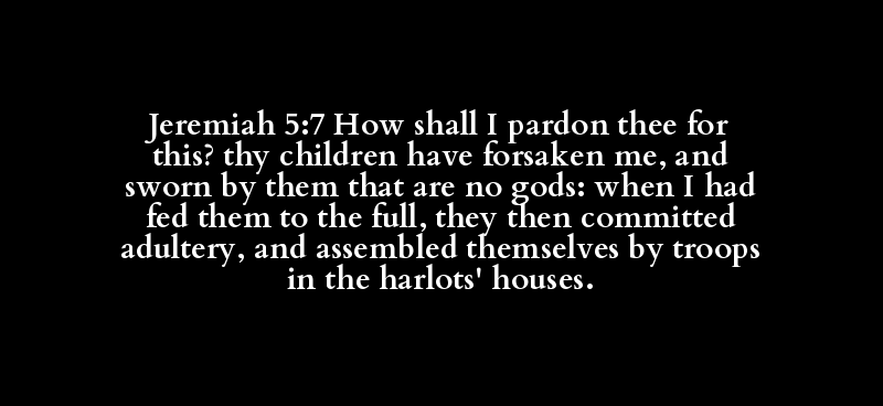Jeremiah 5:7 How shall I pardon thee for this? thy children have forsaken me, and sworn by them that are no gods: when I had fed them to the full, they then committed adultery, and assembled themselves by troops in the harlots' houses.
