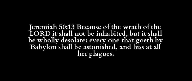Jeremiah 50:13 Because of the wrath of the LORD it shall not be inhabited, but it shall be wholly desolate: every one that goeth by Babylon shall be astonished, and hiss at all her plagues.