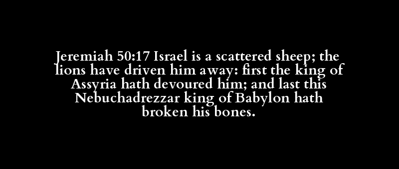 Jeremiah 50:17 Israel is a scattered sheep; the lions have driven him away: first the king of Assyria hath devoured him; and last this Nebuchadrezzar king of Babylon hath broken his bones.