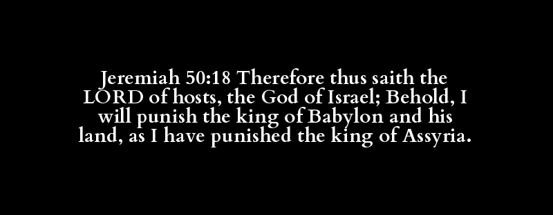 Jeremiah 50:18 Therefore thus saith the LORD of hosts, the God of Israel; Behold, I will punish the king of Babylon and his land, as I have punished the king of Assyria.