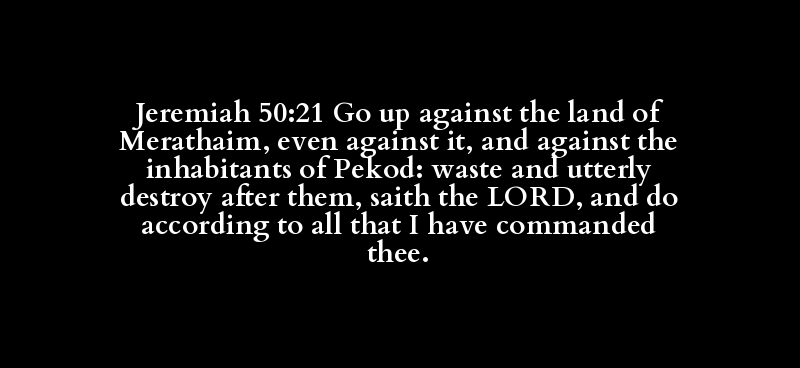 Jeremiah 50:21 Go up against the land of Merathaim, even against it, and against the inhabitants of Pekod: waste and utterly destroy after them, saith the LORD, and do according to all that I have commanded thee.
