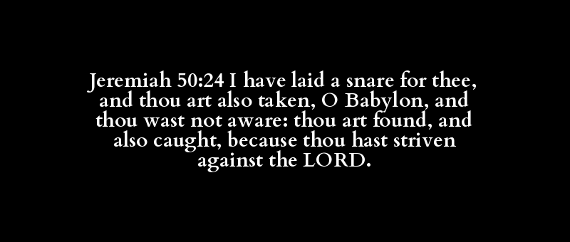 Jeremiah 50:24 I have laid a snare for thee, and thou art also taken, O Babylon, and thou wast not aware: thou art found, and also caught, because thou hast striven against the LORD.