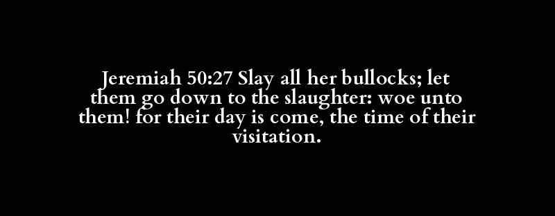 Jeremiah 50:27 Slay all her bullocks; let them go down to the slaughter: woe unto them! for their day is come, the time of their visitation.