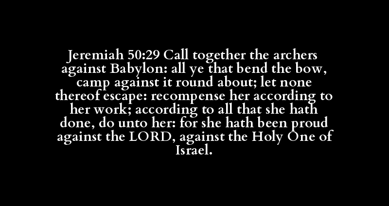 Jeremiah 50:29 Call together the archers against Babylon: all ye that bend the bow, camp against it round about; let none thereof escape: recompense her according to her work; according to all that she hath done, do unto her: for she hath been proud against the LORD, against the Holy One of Israel.