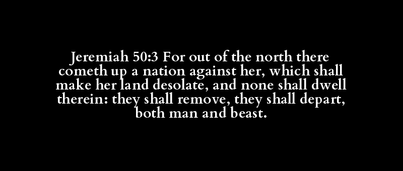 Jeremiah 50:3 For out of the north there cometh up a nation against her, which shall make her land desolate, and none shall dwell therein: they shall remove, they shall depart, both man and beast.