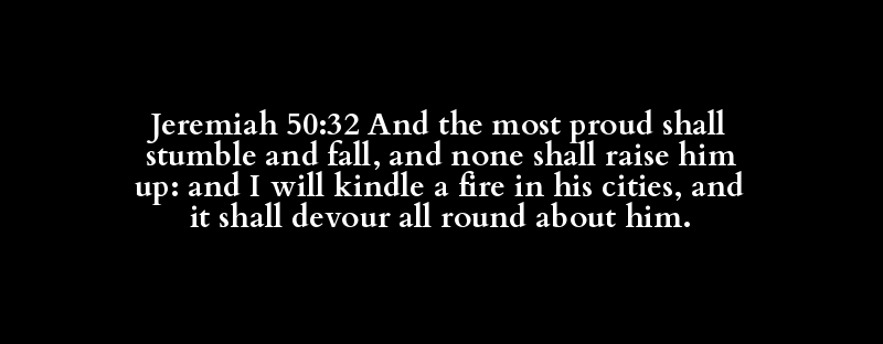 Jeremiah 50:32 And the most proud shall stumble and fall, and none shall raise him up: and I will kindle a fire in his cities, and it shall devour all round about him.