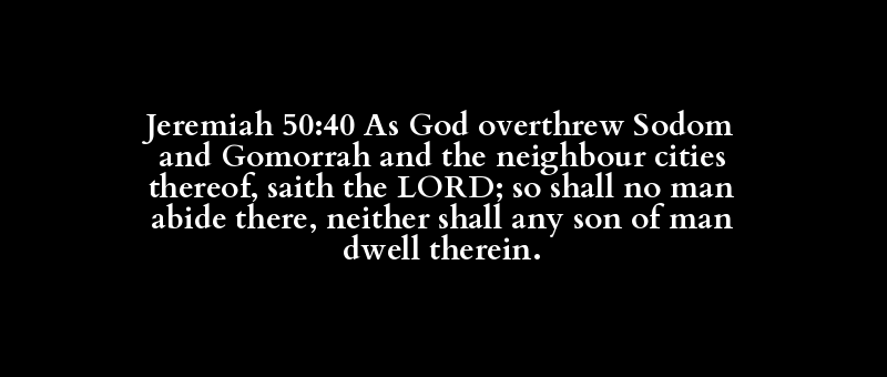 Jeremiah 50:40 As God overthrew Sodom and Gomorrah and the neighbour cities thereof, saith the LORD; so shall no man abide there, neither shall any son of man dwell therein.