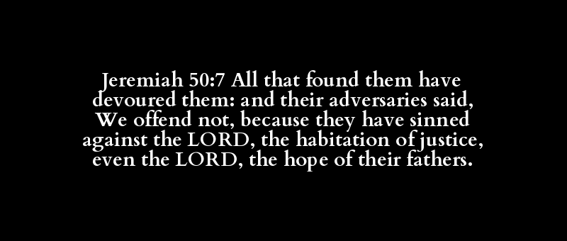 Jeremiah 50:7 All that found them have devoured them: and their adversaries said, We offend not, because they have sinned against the LORD, the habitation of justice, even the LORD, the hope of their fathers.