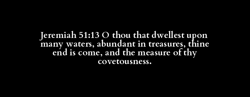 Jeremiah 51:13 O thou that dwellest upon many waters, abundant in treasures, thine end is come, and the measure of thy covetousness.