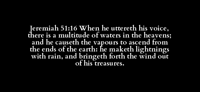 Jeremiah 51:16 When he uttereth his voice, there is a multitude of waters in the heavens; and he causeth the vapours to ascend from the ends of the earth: he maketh lightnings with rain, and bringeth forth the wind out of his treasures.