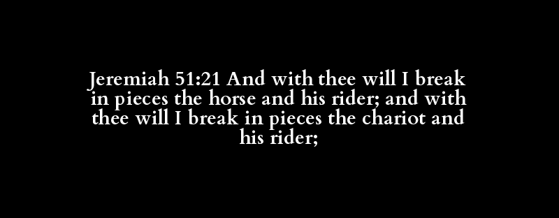 Jeremiah 51:21 And with thee will I break in pieces the horse and his rider; and with thee will I break in pieces the chariot and his rider;