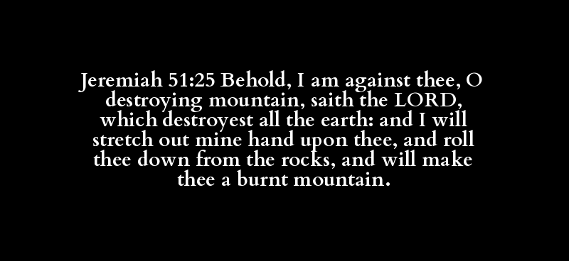 Jeremiah 51:25 Behold, I am against thee, O destroying mountain, saith the LORD, which destroyest all the earth: and I will stretch out mine hand upon thee, and roll thee down from the rocks, and will make thee a burnt mountain.