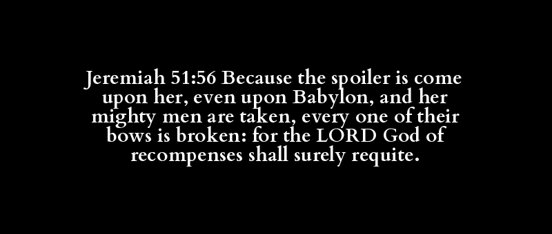 Jeremiah 51:56 Because the spoiler is come upon her, even upon Babylon, and her mighty men are taken, every one of their bows is broken: for the LORD God of recompenses shall surely requite.