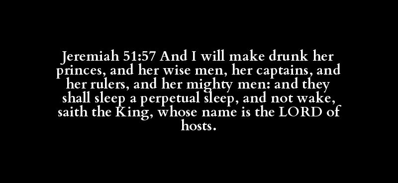 Jeremiah 51:57 And I will make drunk her princes, and her wise men, her captains, and her rulers, and her mighty men: and they shall sleep a perpetual sleep, and not wake, saith the King, whose name is the LORD of hosts.