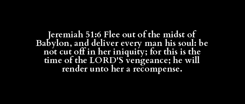 Jeremiah 51:6 Flee out of the midst of Babylon, and deliver every man his soul: be not cut off in her iniquity; for this is the time of the LORD'S vengeance; he will render unto her a recompense.
