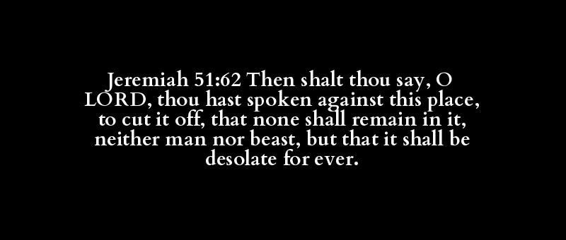 Jeremiah 51:62 Then shalt thou say, O LORD, thou hast spoken against this place, to cut it off, that none shall remain in it, neither man nor beast, but that it shall be desolate for ever.