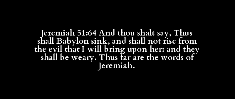Jeremiah 51:64 And thou shalt say, Thus shall Babylon sink, and shall not rise from the evil that I will bring upon her: and they shall be weary. Thus far are the words of Jeremiah.