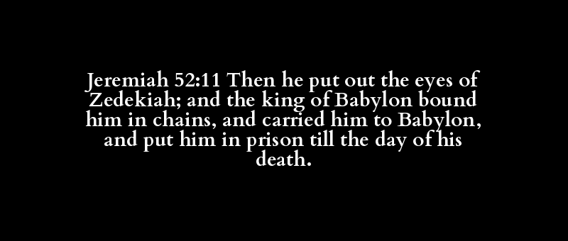 Jeremiah 52:11 Then he put out the eyes of Zedekiah; and the king of Babylon bound him in chains, and carried him to Babylon, and put him in prison till the day of his death.