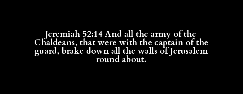 Jeremiah 52:14 And all the army of the Chaldeans, that were with the captain of the guard, brake down all the walls of Jerusalem round about.