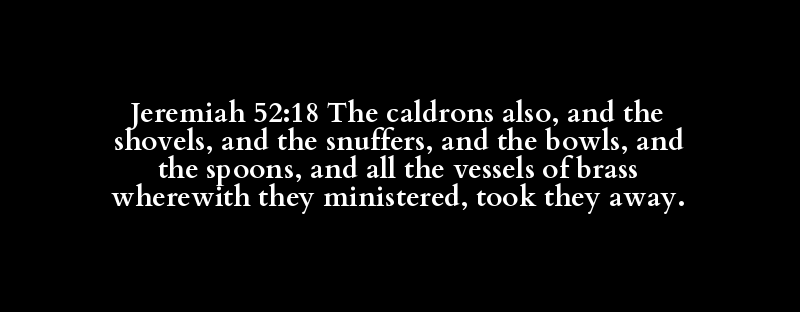 Jeremiah 52:18 The caldrons also, and the shovels, and the snuffers, and the bowls, and the spoons, and all the vessels of brass wherewith they ministered, took they away.