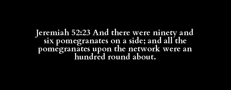Jeremiah 52:23 And there were ninety and six pomegranates on a side; and all the pomegranates upon the network were an hundred round about.