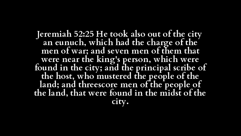 Jeremiah 52:25 He took also out of the city an eunuch, which had the charge of the men of war; and seven men of them that were near the king's person, which were found in the city; and the principal scribe of the host, who mustered the people of the land; and threescore men of the people of the land, that were found in the midst of the city.